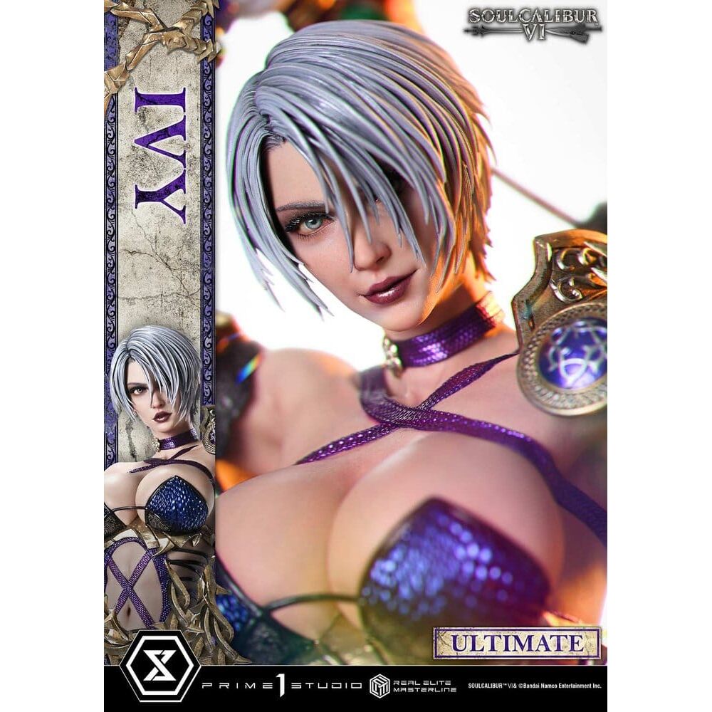 « Ta punition sera très sévère. » La « Twisting Blade of Solitude » prend vie dans une version réaliste à l'échelle 1/4. Avec un reboot qui redonne un nouveau souffle à la série, « SOULCALIBUR ? » est un jeu d'action et de combat à l'arme blanche qui offre un gameplay de haut vol et des graphismes époustouflants. À partir de cet opus, IVY rejoint la gamme Real Elite Masterline. Fille adoptive de la prestigieuse famille Valentine, elle jure de détruire la lame maudite et suit un chemin tracé par le destin. Il s'agit d'une figurine à l'échelle 1/4 qui capture sa grâce et son art du combat à l'épée. Inspirée du visuel du personnage, sa pose la montre brandissant l'épée magique en forme de fouet, l'IVY Blade. De la torsion de son torse au poids placé sur son pied droit alors qu’elle s’avance, chaque détail a été méticuleusement conçu pour créer une élégante impression de dynamisme. Les mèches fluides de sa chevelure argentée et souple, les motifs complexes de ses iris, la brillance de son rouge à lèvres humide. Ses traits raffinés donnent vie à l’univers du jeu avec réalisme. De son physique alliant féminité et force à son costume soigné jusque dans les nuances de violet, chaque détail offre une finition richement détaillée. Le socle spécial s’inspire du « Sanctuaire d’Eurydice : Cloud Sanctuary ». Son design, tiré de l’un des niveaux les plus emblématiques de la série, renforce l’immersion dans l’univers du jeu. Un torse interchangeable qui brandit le fouet en arrière et provoque d’un geste de la main. Une tête interchangeable qui se courbe en un sourire confiant. Des pièces supplémentaires pour modifier l’ambiance de votre présentation sont également incluses. Combinez-les avec le socle d’arrière-plan et le socle de buste pour mettre en scène sa silhouette héroïque exactement comme vous le souhaitez. La Twisting Blade of Solitude arrive à l’échelle réaliste 1/4. Des techniques de sculpture et de peinture raffinées qui vous toucheront au plus profond de votre âme.